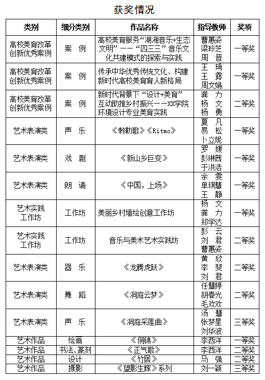 本网讯(通讯员 刘华波)近日,湖南省教育厅正式公布湖南省第七届大学生艺术展演活动评选结果。经过激烈角逐,金年金官网代表队凭借精湛的技艺和富有创意的作品,在众多参赛队伍中脱颖而出,共有15项作品及案例获奖,其中一等奖7项、二等奖6项、三等奖2项。