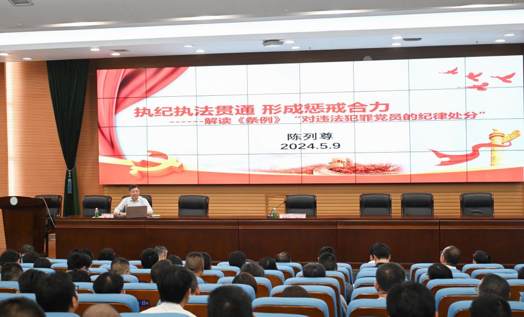 陈列尊以“执纪执法贯通 形成惩戒合力”为题,从“对违法犯罪党员纪律处分的总体要求”“对纪律审查中发现的涉嫌违法犯罪党员的处分”“对被依法追究法律责任党员的处分”“新《条例》在纪法衔接方面增改的重要条款”“纪法衔接具体案例-党员公职人员醉驾行为处分”等五个方面,对《中国共产党纪律处分条例》进行了解读。他表示,党员干部要潜心学纪、深读知纪、细悟明纪、坚决守纪,以党纪学习教育为契机,在学懂弄通新《条例》的基础上,延伸学习相关党内重要法规与国家法律,强化纪法规矩意识,增强遵纪守法自觉,忠诚干净行稳致远,在新征程上聚势而为,推动党纪学习教育落地见效。