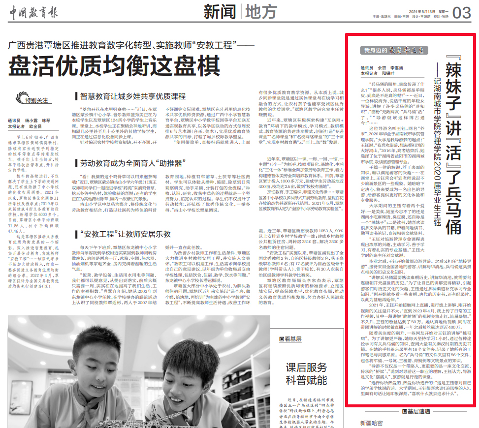 本网讯 5月13日,《中国教育报》第3版报道金年金字招牌诚信至上管理学院2020届优秀校友王钰讲“活”兵马俑、火爆全网的青春励志故事。全文如下: