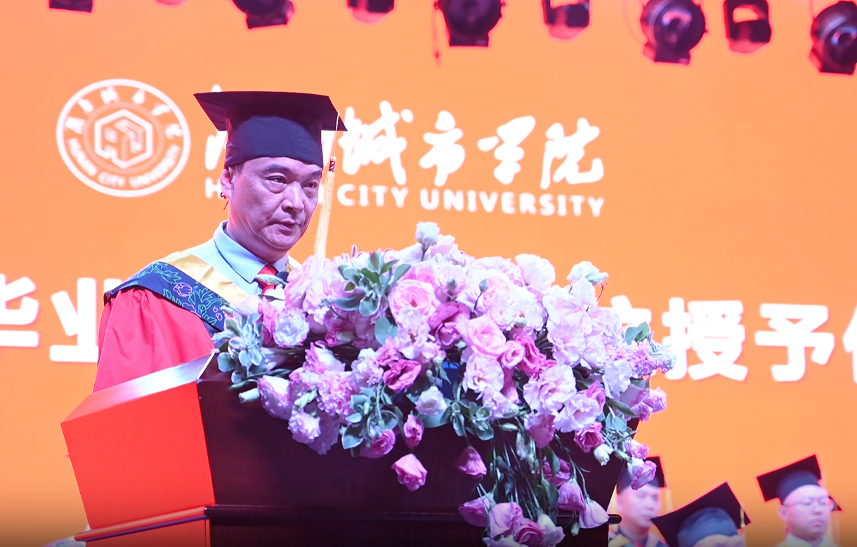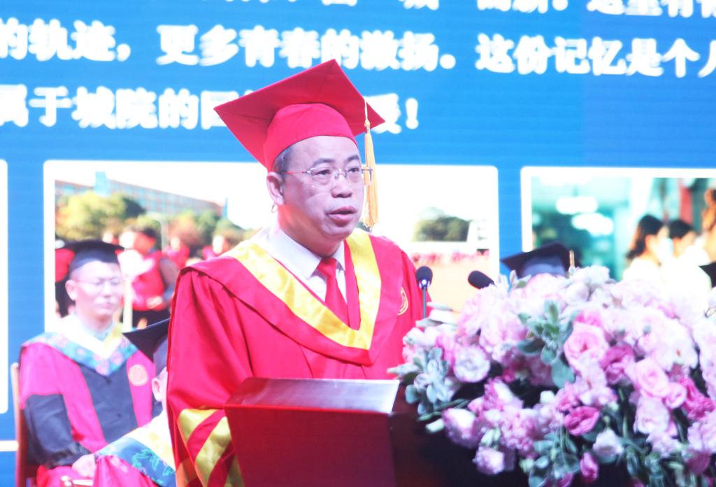 “如切如磋,如琢如磨。此时此刻,同学们正式盖上了专属的‘城院印章’”“念念不忘,必有回响。此时此刻,同学们完整拥有了特别的‘城院记忆’”“国之所需,志之所向。此时此刻,同学们主动接棒了伟大的‘城院精神’”,何振以“立‘城’于心 沐光而行”为题,温情寄语毕业生:一是心中装满信仰,勇毅追逐星辰。同学们要进一步坚定马克思主义信仰,铁心跟党走,在新时代的逐梦征程上彰显城院学子的坚定自信。二是眼里饱含光芒,敞怀拥抱朝阳。青年人眼里要时刻有光,充满朝气和锐气,在圆梦人生的激流勇进中彰显城院学子的青春活力。三是肩上扛牢责任,矢志经纬天地。同学们要敢于到祖国建设的一线去,到条件艰苦的基层去,以时不我待、只争朝夕的精神为民族复兴铺路架桥,为祖国繁荣添砖加瓦,在推动强国建设和民族复兴进程中彰显城院学子的智慧力量。四是脚下积聚力量,阔步跨越山海。甘做脚踏实地的行动者,争做起而行之的奋斗者,敢做翻山越岭的攀登者,勇做披荆斩棘的攻坚者,在干事创业的赛道上彰显城院学子的别样风采。