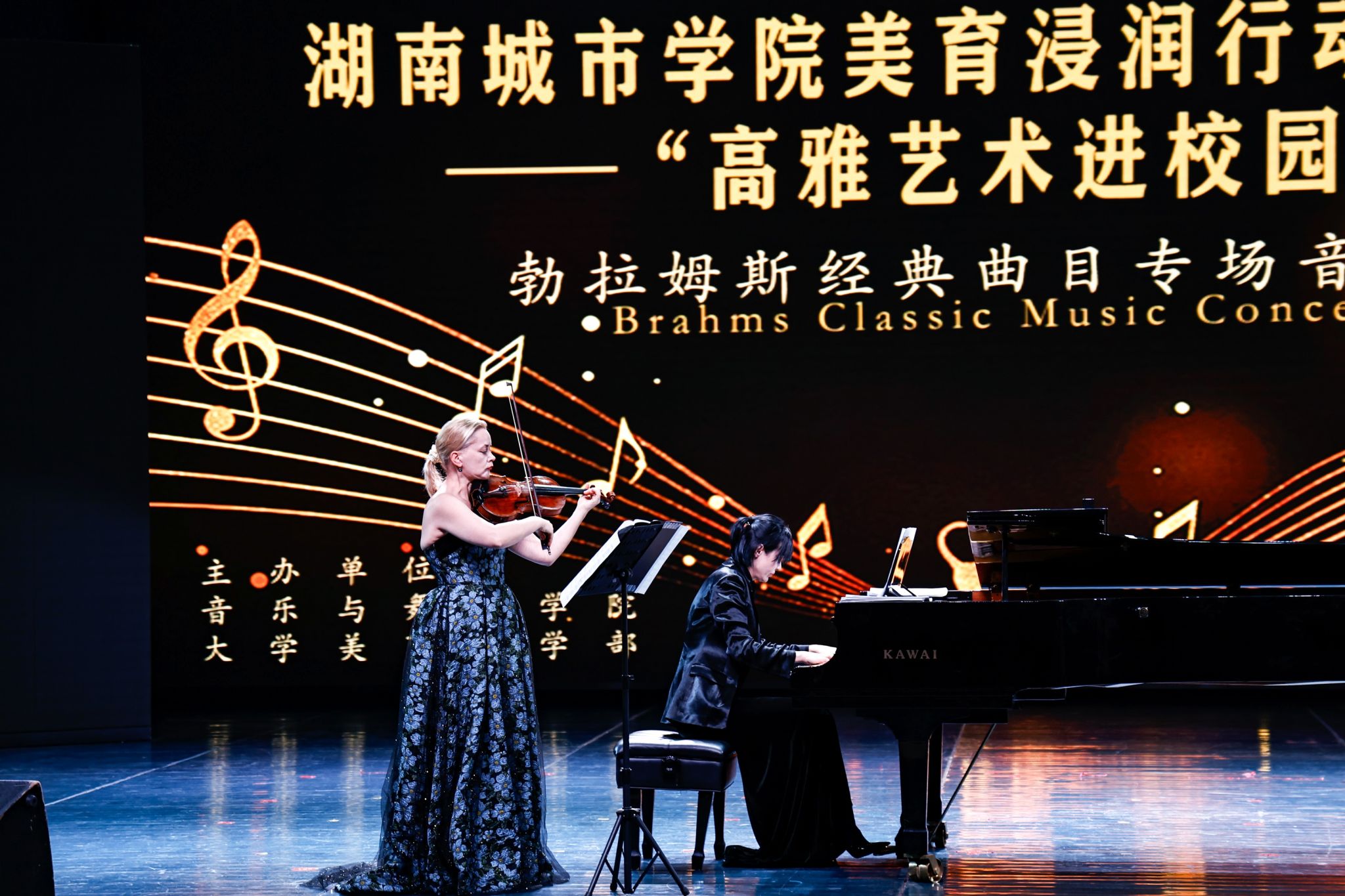 本网讯(通讯员 谢立新)12月16日晚,“勃拉姆斯经典曲目专场音乐会”在音乐厅上演。由乌克兰籍钢琴家、音乐与舞蹈学院教师孙·娜塔丽雅,携手俄罗斯籍小提琴家、湖南理工学院教师安娜·加宁联袂出演,呈现了勃拉姆斯流传下来的仅有的三首小提琴奏鸣曲。