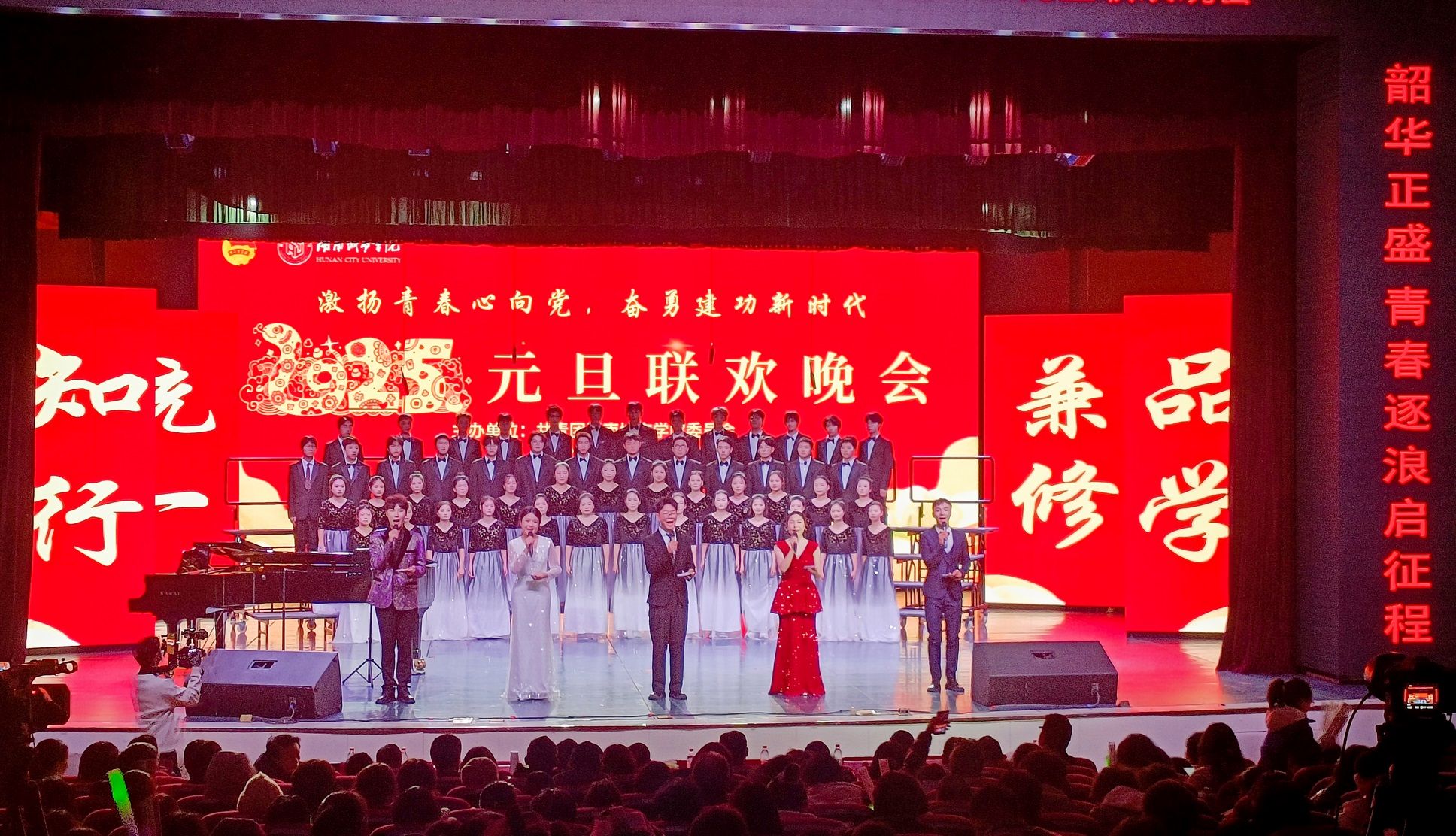本网讯(通讯员 孔军)祥龙贺岁辞旧去,灵蛇纳祥启新程。12月30日晚,金年金官网在音乐厅举行2025年元旦晚会。全体校领导,各二级学院、部门相关负责人出席观看晚会。在两个多小时的晚会中,线上线下12000余名师生、校友欢聚一堂,共同辞旧迎新。