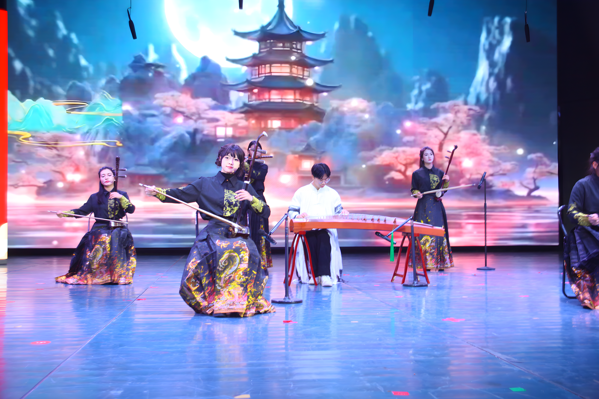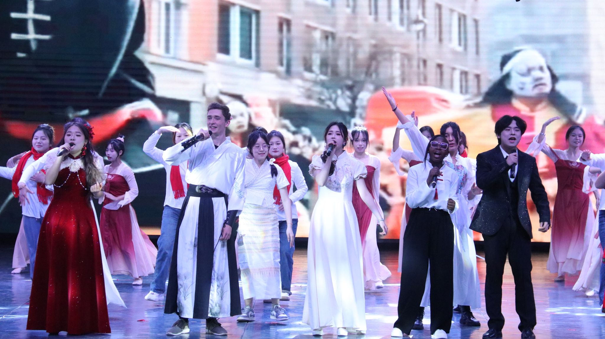 晚会在磅礴大气的《醒狮》中拉开帷幕,街舞社15名身着传统服饰的舞者,在铿锵有力的音乐声中,将传统醒狮舞与街舞相结合,瞬间点燃了现场氛围;离退休教师们带来的太极舞《鸿雁》,将太极拳的招式和动作巧妙地融入舞蹈中,为观众呈现了一种独特的视觉效果;由中外学子联合呈现的歌舞《相亲相爱一家人》不仅展示了中外学生们的才艺与风采,更以其独特的文化融合和深情演绎,激发了现场观众的热烈反响,来自乌克兰、摩洛哥、加纳等6个国家的留学生身着各具特色的服饰,伴随着欢快的音乐节奏,翩翩起舞,收获现场观众们的热情掌声;研究生院带来的舞蹈《桃花朵朵开》,通过精湛的舞技和默契的配合,将这支舞蹈的欢快与喜庆展现得淋漓尽致。