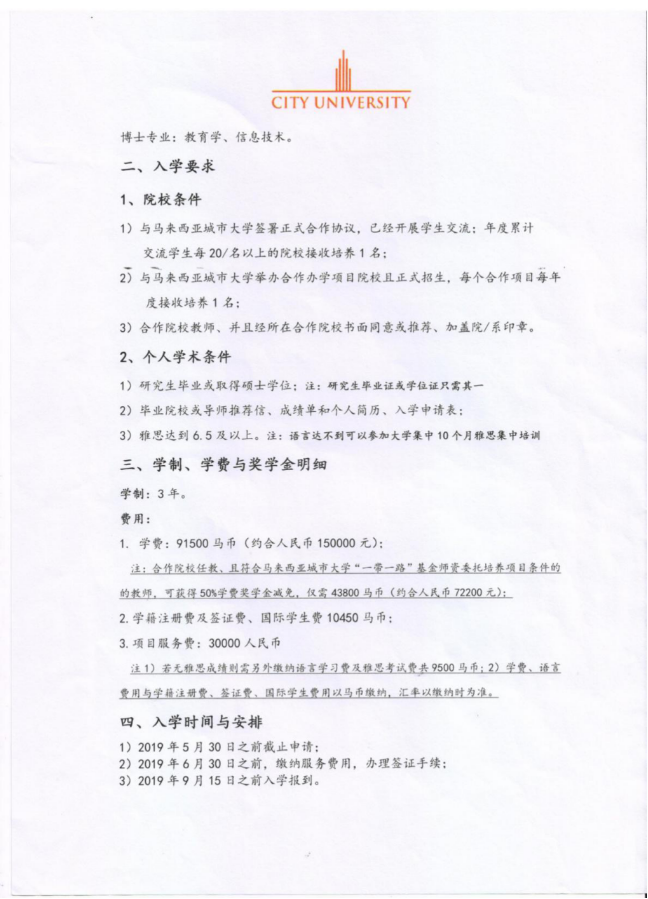 关于赴马来西亚城市大学攻读博士的通知