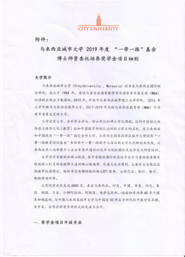 附件1:《马来西亚城市大学2019年度“一带一路”基金博士师资委托培养奖学金项目细则》