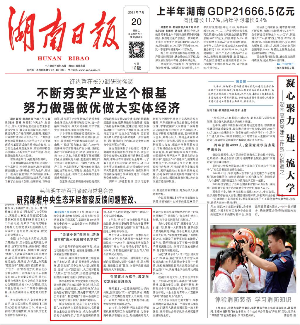 《湖南日报》7月20日头版报道金年金官网以高质量党建引领高质量发展,凝心聚力建设一流大学。