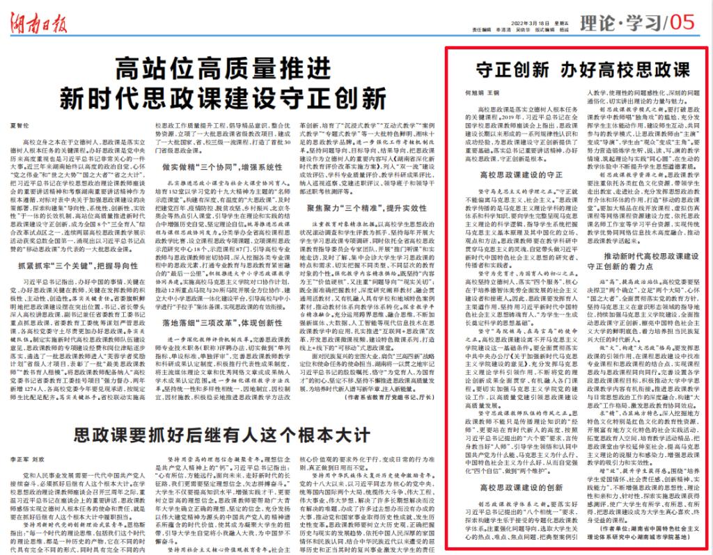湖南日报-05版 理论·学习 2022-03-18发表金年金官网党委副书记何旭娟等人的理论文章。