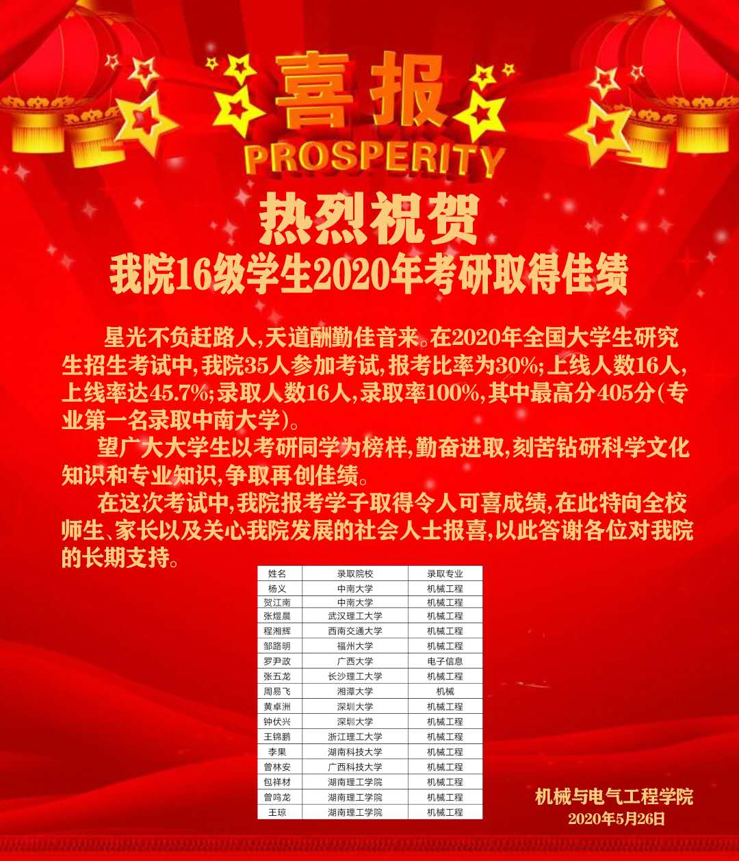 热烈祝贺我院16级学生2020年考研取得佳绩