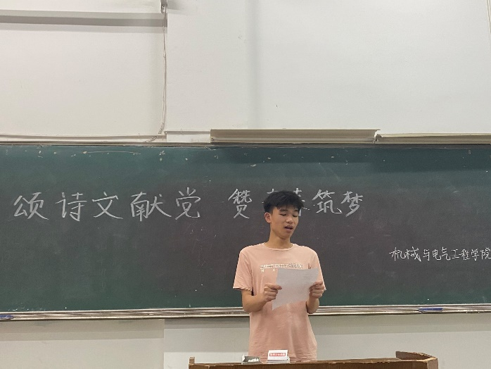2021年正值建党100周年,为了歌颂党的伟大成就,增强同学们的爱党爱国之情,提高当代大学生的政治觉悟,丰富当代大学生的课余文化生活,机械与电气工程学院于2021年5月9日在一教110教室举行“颂诗文献党,赞青春筑梦”诗文朗诵比赛。此次比赛的评委有机械与电气工程学院团委、学生会执行主席胡皓宇、学习部部长林逸翔、学习部副部长赖琪、办公室部长邓功涛和办公室副部长扶轩程。