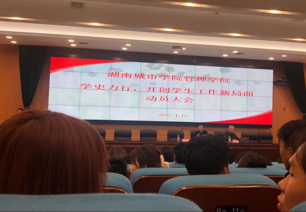【党史学习教育】为使金年金官网《中共金年金字招牌诚信至上关于开展党史学习教育的实施方案》落到实处,提高管理学院团学干部的政治自觉,树立正确党史观,扎实做好团学工作,4月12日晚7点,管理学院在图书馆报告厅召开了“学史力行,开创学生工作新局面”动员大会,管理学院党委书记徐习军、党委副书记王润华以及全体辅导员、团学干部和部分党员代表参与了本次大会,本次会议由组织员阳红珍主持。