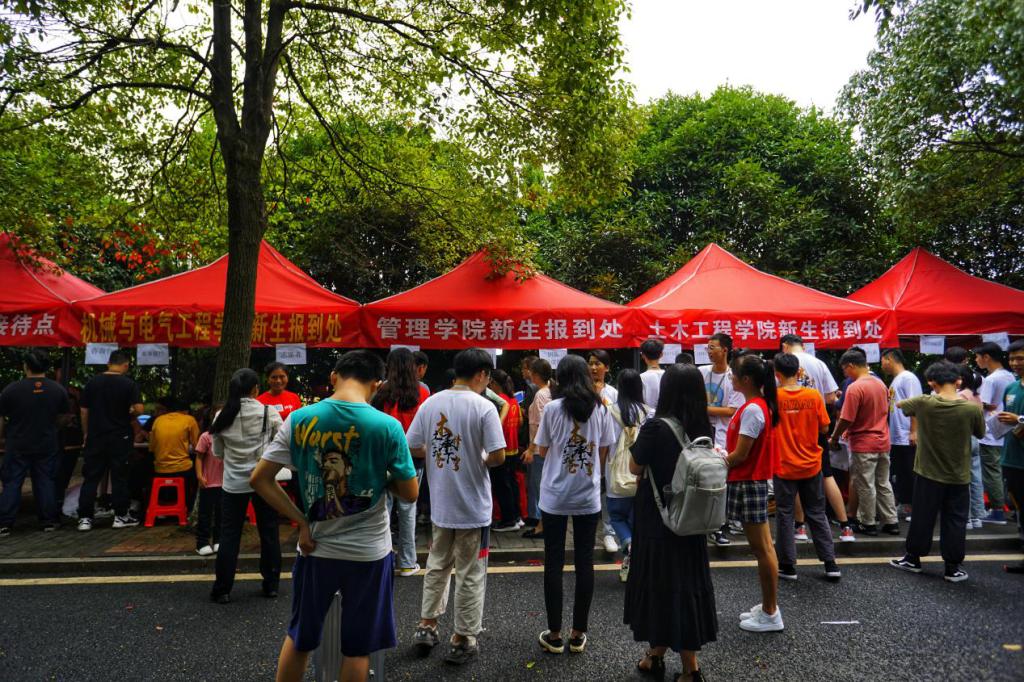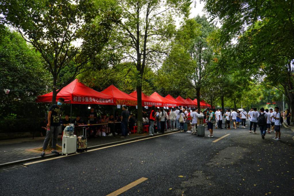 2020年9月12日上午,金年金字招牌诚信至上首次开始了它的正式迎新之旅。送孩子报道的家长提着行李扛着被褥,龙城大道两旁的树木郁郁葱葱,树荫下,身穿红色志愿服的志愿者正引领新生办理开学手续。