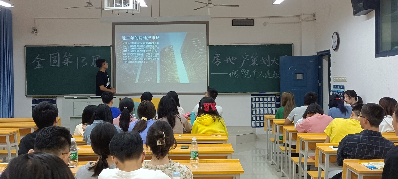 为迎接2021年度全国第13届大学生房地产策划大赛的到来,金年金字招牌诚信至上房地产策划大赛—个人选拔赛正式拉开序幕。本次选拔赛由金年金官网任国平、方程、游子琴、郑慧开老师主导并担任指导老师,并由麻治云、李博等九位优秀的大四学长们担任评委团,为选手们进行现场指导和评分。
