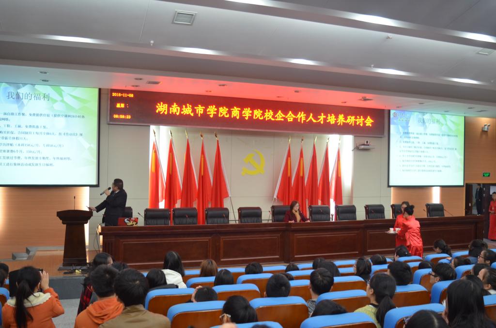 会议分为两个程序:校企合作人才培养研讨会和学生实习专场招聘会,分别由商学院党总支书记郭白泉和商学院副院长王莉主持主持,学校党委副书记汤放华、商学院党政班子成员、各教研室主任及教师代表参加研讨会,就企业对所需人才应具备的专业知识结构、能力素质素养等进行了深入的交流探讨,对校企如何深度融合、完善人才培养方案作了专题研究,校企达成了更广泛的认识。