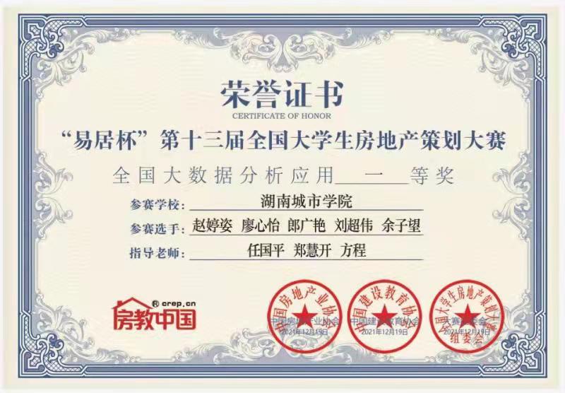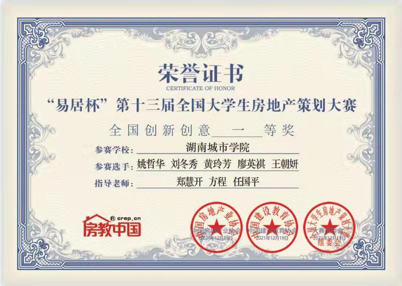 金年金官网共派出六支队伍参赛,在管理学院郑慧开老师、任国平老师、建筑与城市规划学院方程老师认真严谨的指导下,参赛同学刻苦努力备赛。其中由19级房地产开发与管理专业姚哲华、廖英祺、黄玲芳、刘冬秀、赵婷姿、廖心怡、郎广艳、刘超伟、18级城乡规划专业王朝妍、余子望共十位同学组成的两支队伍均获全国一等奖。其余四支队伍分别获全国二、三等奖,金年金官网并获大赛“优秀组织高校”荣誉,创历史新高!