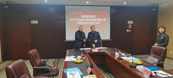 在长沙千龙湖生态旅游度假有限公司,王润华书记和长沙千龙湖生态旅游度假有限公司董事长陈露,进行了深入的交流,并代表双方签定了毕业生就业基地建设协议书,并举行挂牌仪式。