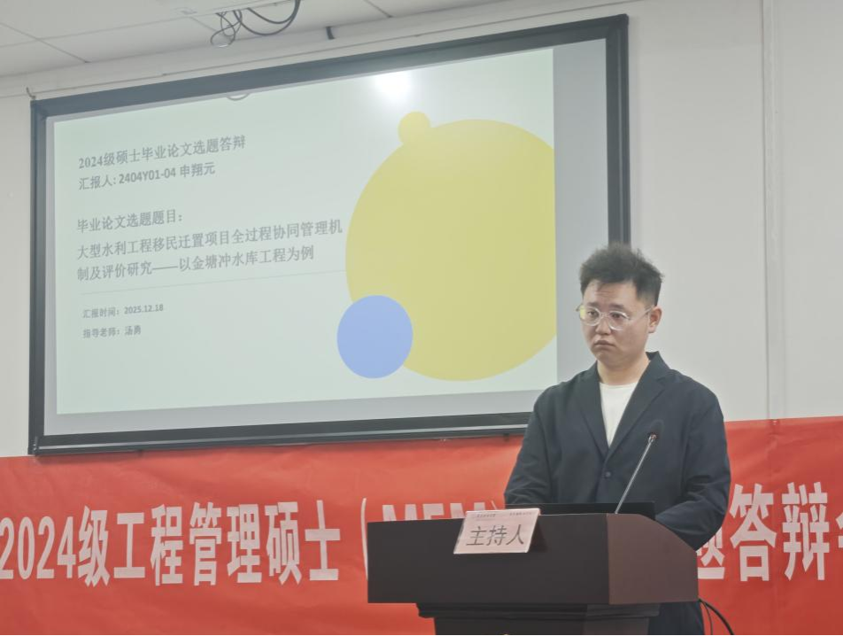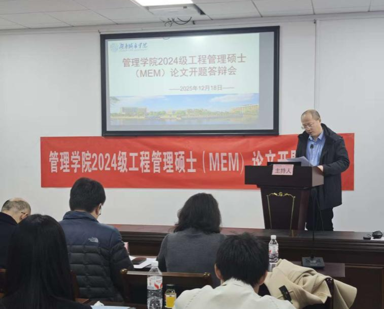 本网讯(通讯员:吕鑫雨、张胜)2025年12月18日,管理学院2024级工程管理专业硕士研究生学位论文开题报告会在管理楼504会议室顺利举行。报告会由管理学院院长汤勇教授主持。评审专家由副校长孙倩教授、管理学院汤勇教授、任国平教授、刘刚教授等校内专家,及益阳市公路建设养护中心正高级工程师王曦(担任答辩主席)共同组成。2025级相关专业硕士研究生代表到场旁听。