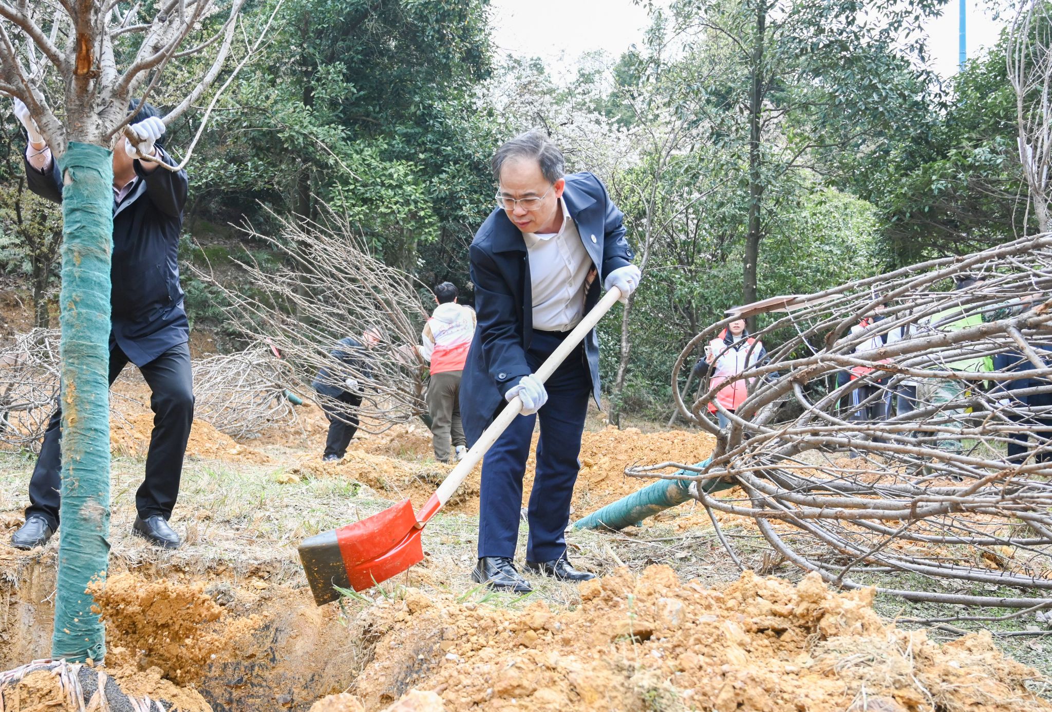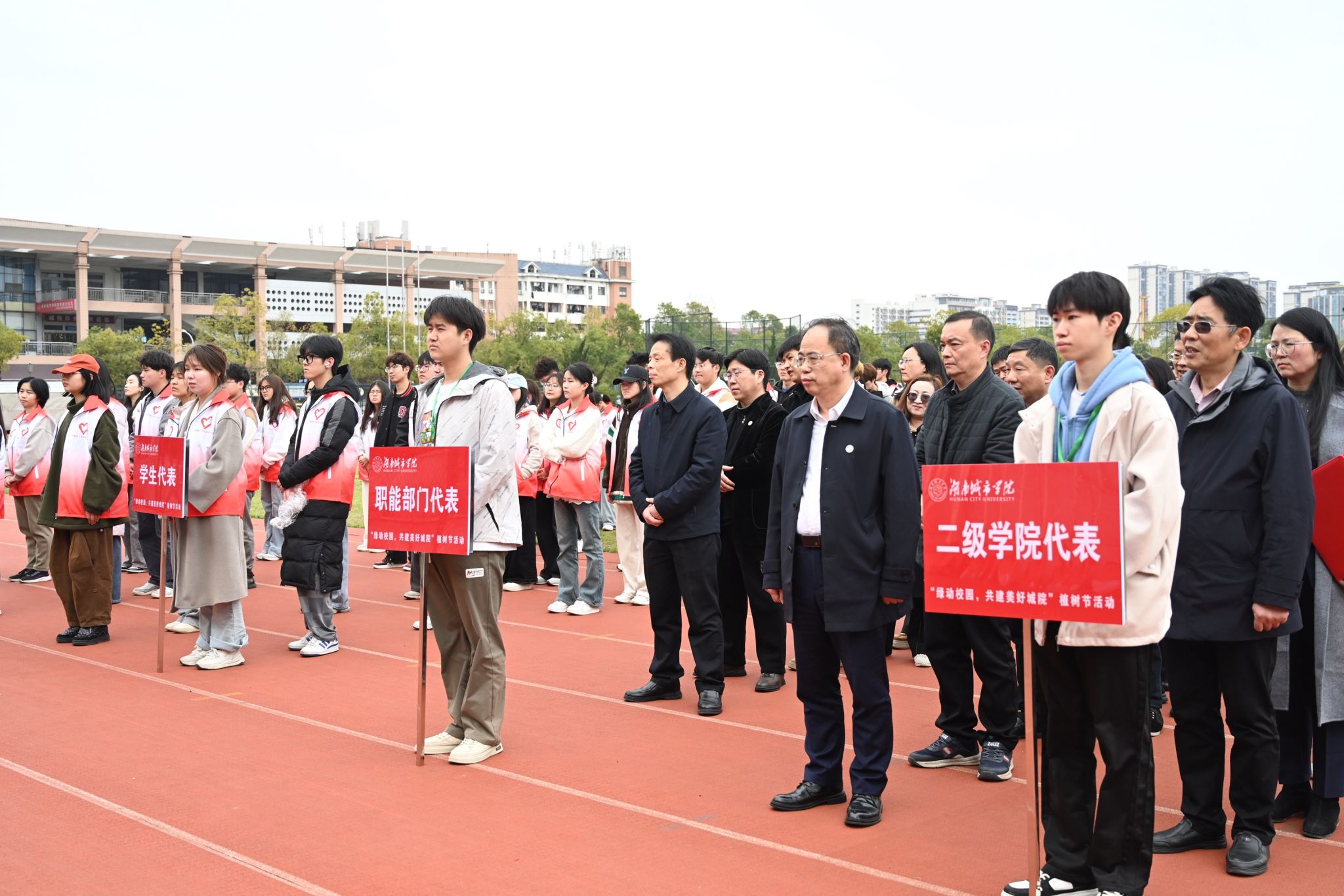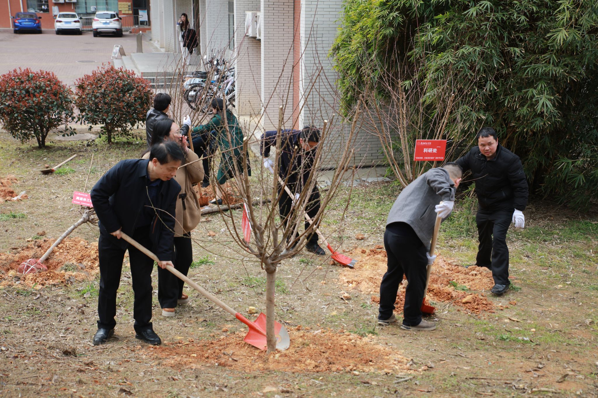 全体中层正职、各职能部门代表、各学院师生代表参加植树实践活动。