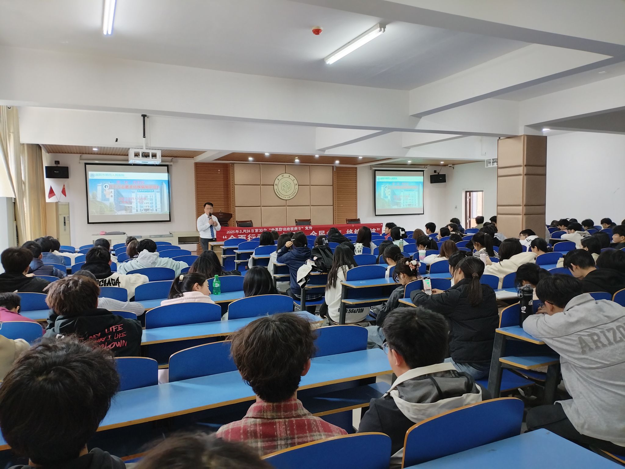 3月20日下午,学校开展了结核病防治宣教讲座。益阳市疾病预防控制中心结核病防治科科长夏哲莅临指导,益阳市第四人民医院肺病科副主任龙奇、感染康复科副主任刘坤等两位医学专家分别以“新时代结核病的防治”“结核病与艾滋病的相互关系”为题作了精彩宣讲,300多名师生聆听了专家讲课。为了增强宣讲效果,两位专家还设置了互动环节,耐心细致地为师生答疑解惑,通过有奖问答的方式,激发师生们学习结核病防治知识的积极性,师生举手答题踊跃,现场气氛热烈。