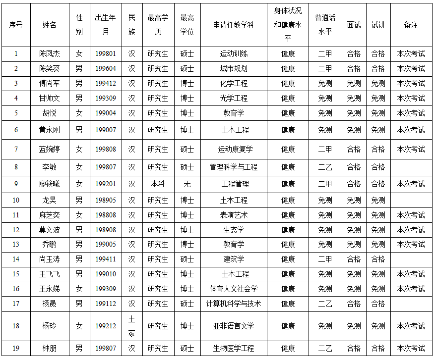 根据教育厅《关于做好2024年全省教师资格认定工作的通知》《关于进一步规范高校教师资格认定与管理工作的通知》的要求,经个人申报、专家评审同意陈凤杰19申请2024年秋季批次高校教师资格认定,其中15人参加今年的岗前培训考试,待考试成绩在教育厅审批之前出来才能通过本次认定申请。现予以公示52024111日至115,如有异议请在公示期内以书面形式反馈人事处。