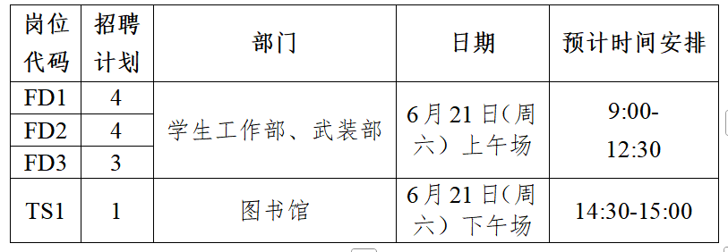 ④面试时间:面试时间为6月21日(周六)9:00-15:00,具体时间安排根据实际情况即时调整通知。参加上午场次的面试入围人员在上午8:30前应全部到达指定等待室;参加下午场次的面试入围人员在下午14:00前应全部到达指定等待室;考生进入等待室后进行考生身份查验确认,并抽签决定面试顺序。