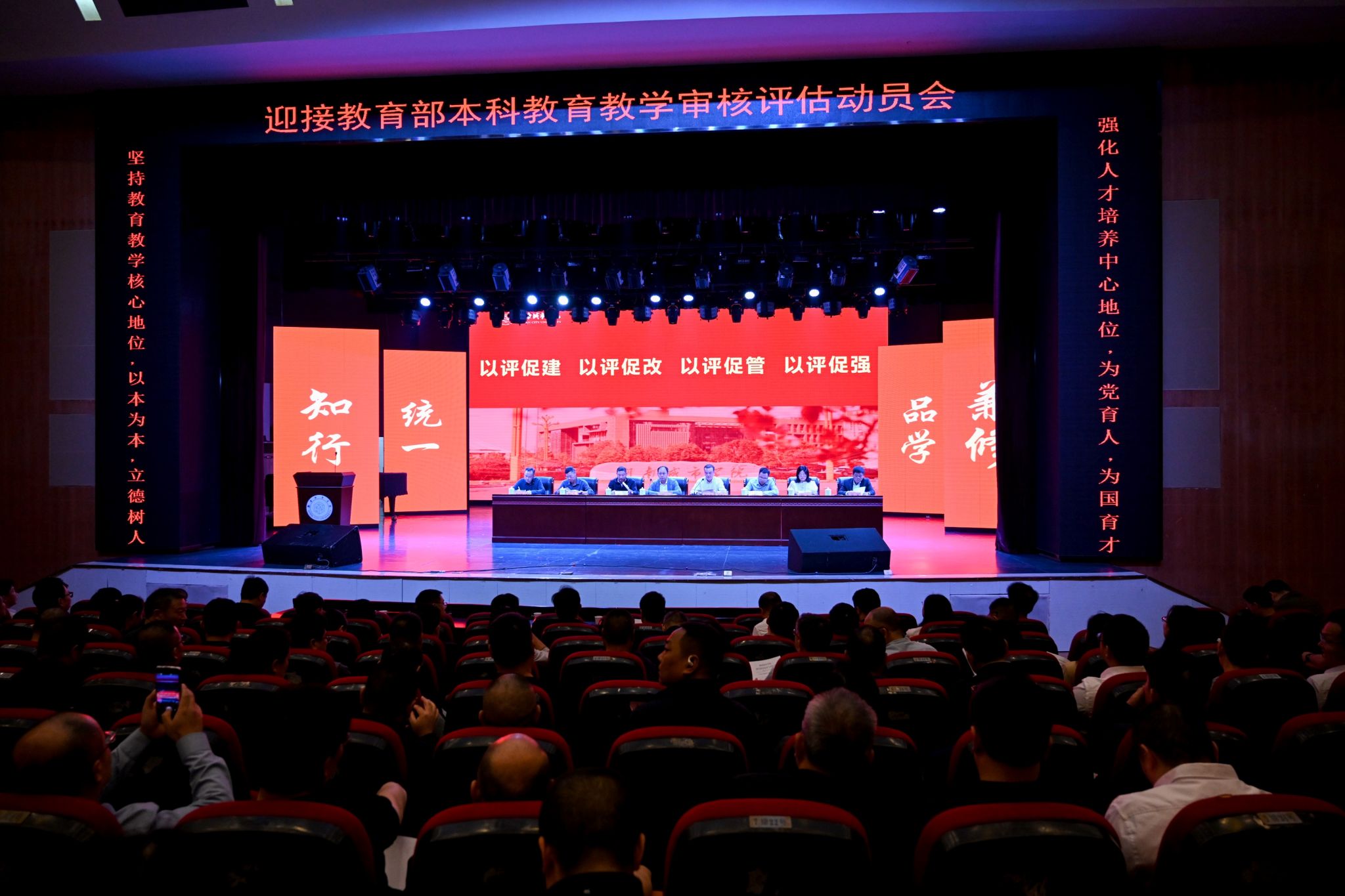 为高质量完成本科教育教学审核评估各项工作,以最佳状态迎接教育部审核评估专家组的评估指导,10月7日下午,学校在音乐厅召开本科教育教学审核评估迎评动员会,全体校领导出席。校长何振强调,全校师生要以乘势而上的冲劲、雷厉风行的作风、求真务实的行动,戮力同心、砥砺前行,打赢这场审核评估“攻坚战”,全力以赴确保本科教育教学审核评估高水平完成。