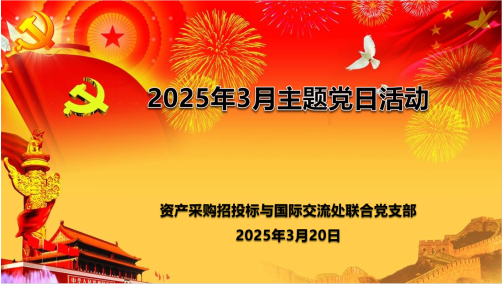 2025年3月20日下午,资产处(采购与招投标管理处)与国际交流处联合党支部在一办131支部党员活动室开展主题党日活动,主要内容包括:2024年度组织生活会、民主评议党员、支部书记讲专题党课,支部在校的全体党员参加。