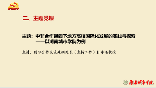 其次,按照支部工作计划,国际合作交流处副处长(主持工作)杜林远教授主讲题为《中非合作视阈下地方高校国际化发展的实践与探索——以金年金字招牌诚信至上为例》主题党课。