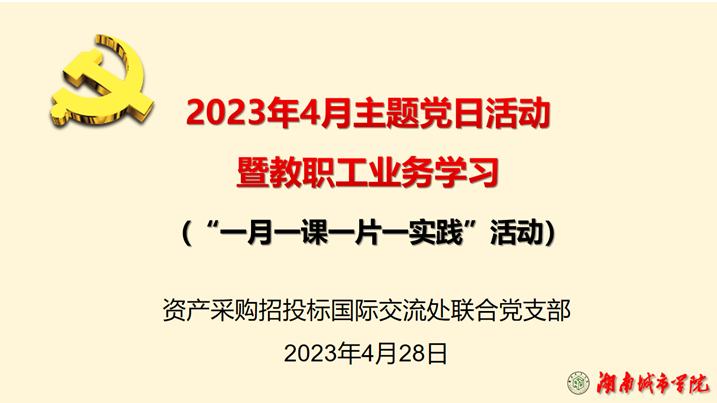 2023年4月28日上午,资产处、采购与招投标管理中心、国际交流处联合党支部在一办公楼131室(支部活动室)开展了主题党日活动暨教职工业务学习,党支部书记肖爱民主持,三部门全体教职工参加。
