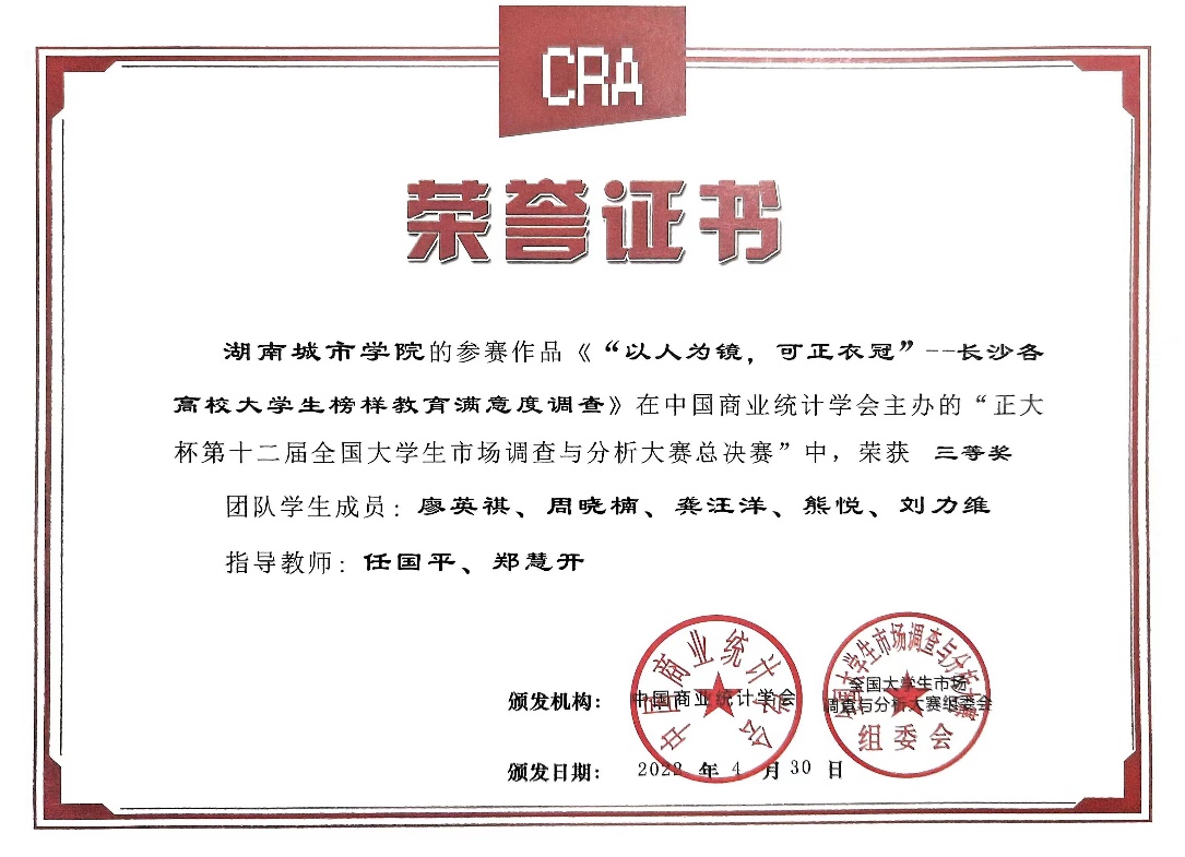 金年金字招牌诚信至上高度重视此次比赛,在教务处大力支持下,管理学院郑慧开、任国平、丁鸣老师组织大赛和指导团队,成功地吸引广泛学生积极地参加比赛。经过校赛个人选拔,入选省赛队伍为4支,经过省赛279支队伍激烈的角逐,层层选拔后,最终金年金官网学生廖英祺、周晓楠、熊悦、龚汪洋、刘力维同学在本届大赛全国总决赛中获得国家级三等奖1项,时过两年再获国家级奖次。此外,在湖南赛区选拔赛中,金年金官网学子还获得了省级二等奖1项,省级三等奖2项。
